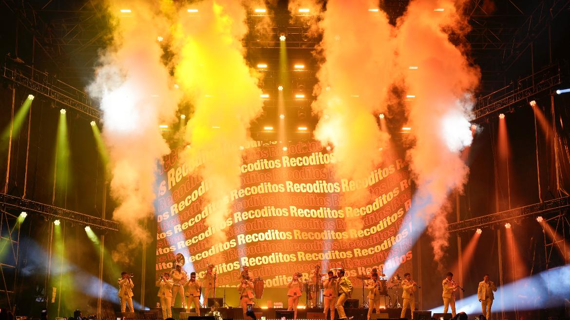 Acompañados de humo, luces y bengalas, Los Recoditos animaron constantemente a la gente a brincar, cantar y bailar, manteniendo el ánimo arriba pese a la lluvia persistente.