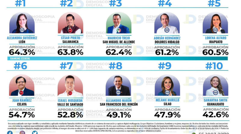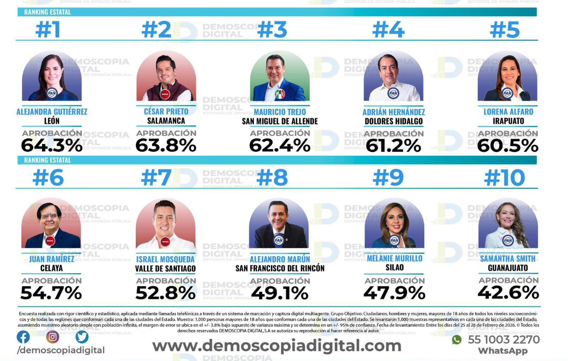 León, Gto. 16 marzo 2026. (Al Instante).- De acuerdo con una encuesta de la empresa Demoscopia Digital, la alcaldesa de León, Alejandra Gutiérrez, se ubica con la mayor calificación aprobatoria entre los presidentes municipales en el estado de Guanajuato.