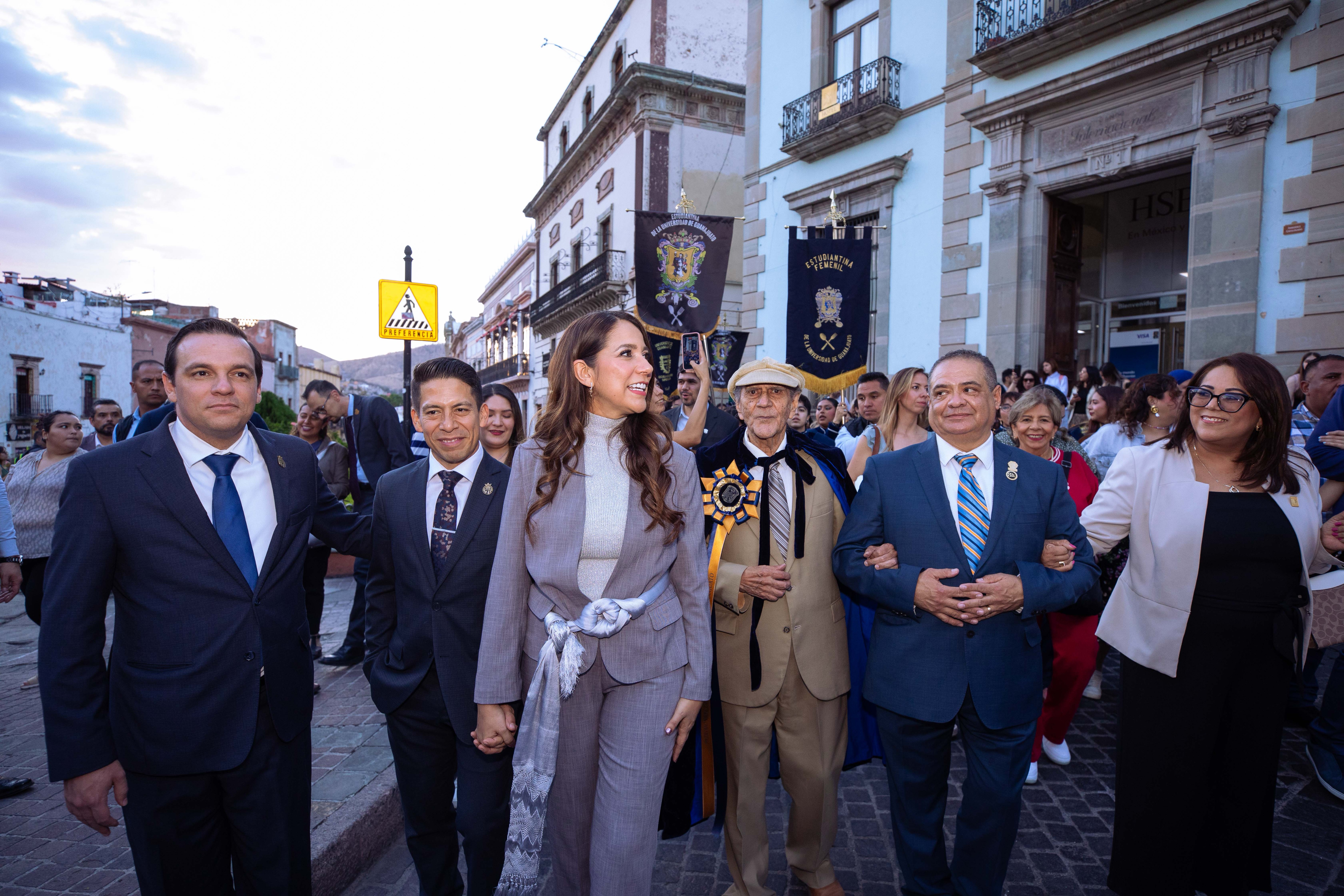 Posteriormente, la Gobernadora Libia Dennise y las personalidades que le acompañaron, caminaron hasta el Teatro Juárez, con la Estudiantina de la UG siguiendo sus pasos y entonando las canciones que han hecho famosas.