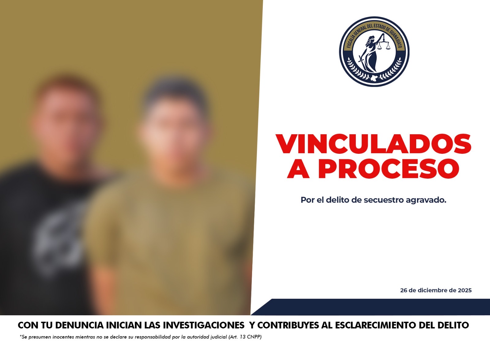 León, Gto. 26 diciembre 2025. (Al Instante).- Elementos de la Fiscalía General del Estado de Guanajuato lograron el rescate de una víctima de secuestro y la captura y vinculación a proceso de Octavio Raúl “N” y Fernando “N”.