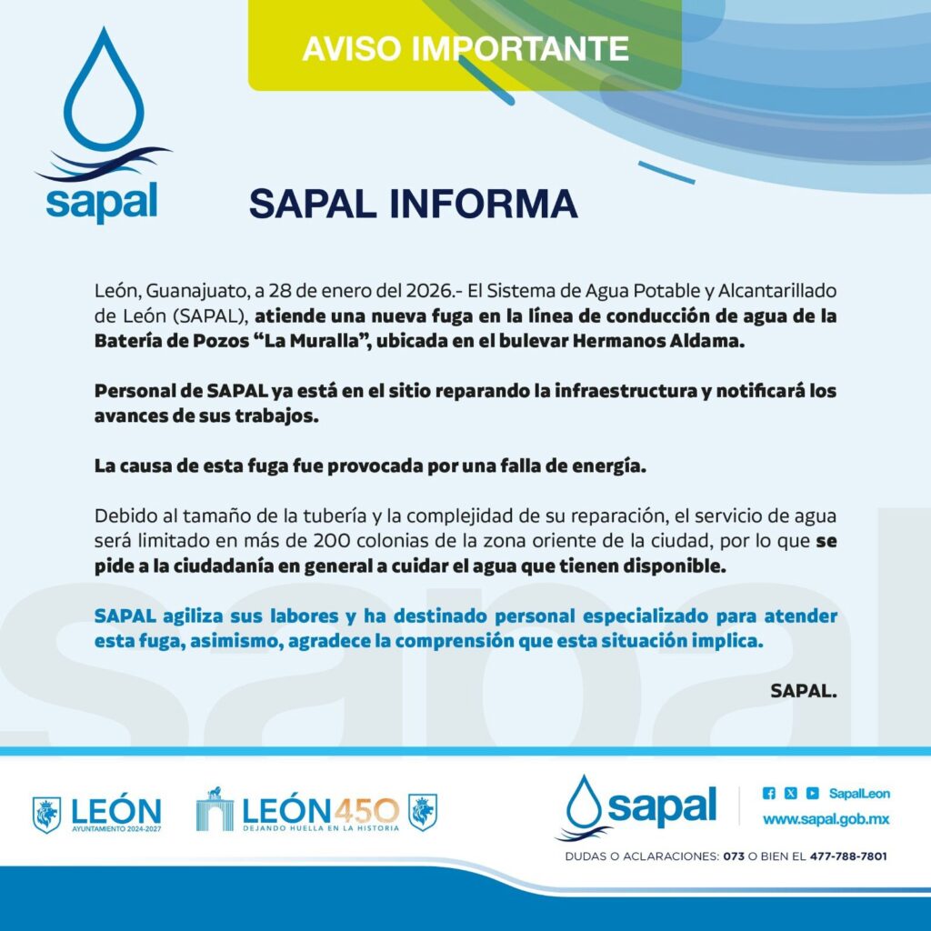León, Gto. 28 enero 2026. (Al Instante).- Una nueva fuga en la Batería de Pozos de La Muralla, “limitara” el servicio de agua potable en 200 colonias de la Ciudad de León.