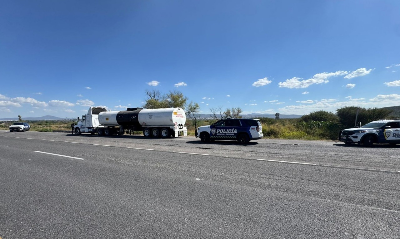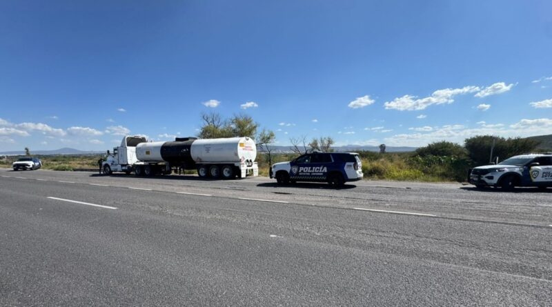 Policía Estatal de Caminos asegura pipa cargada con combustible robado en Apaseo el Grande.