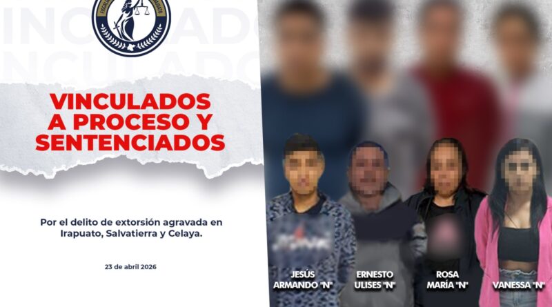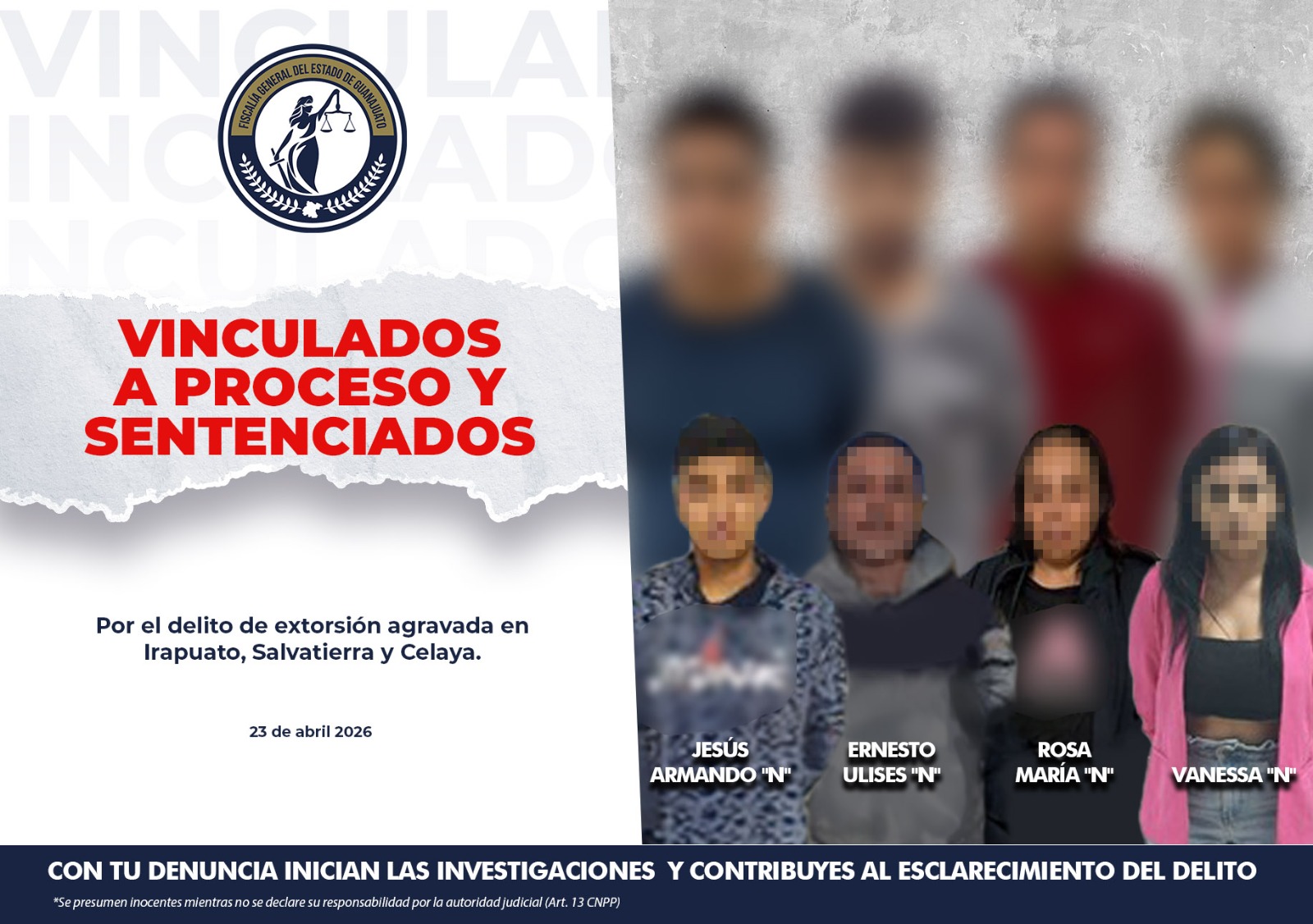 Guanajuato, Gto. 23 abril 2026. (Al Instante).- Tras una Investigación conjunta entre la Unidad Especializada en Combate al Secuestro y Extorsión junto con la Célula Especializada en Combate a la Extorsión de la Agencia de Investigación Criminal, la Fiscalía de Guanajuato logró obtener sentencias de prisión y vinculaciones a proceso en contra de integrantes de la delincuencia organizada, que actuaban en contra comerciantes y habitantes en diversos municipios del estado.