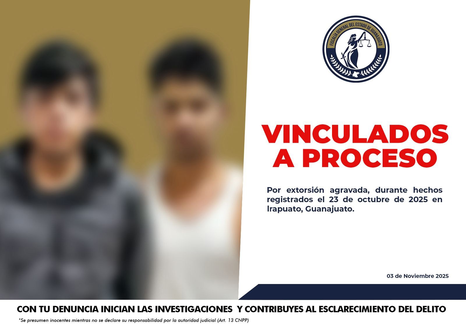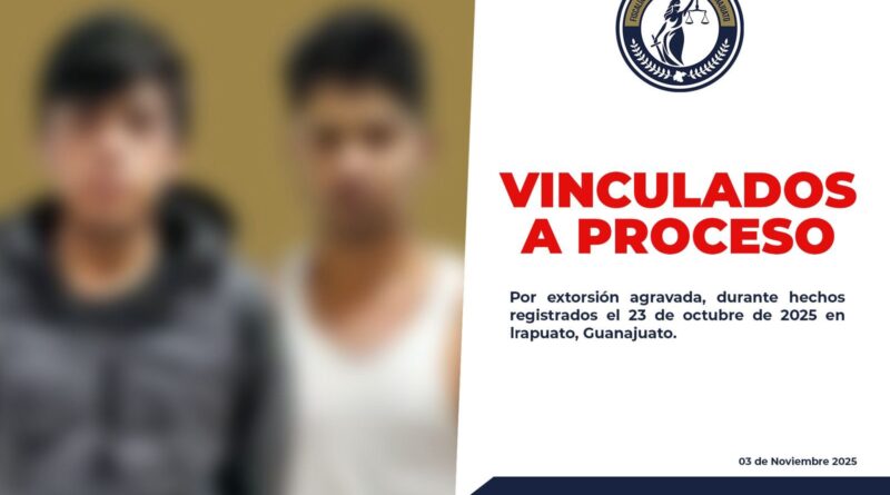 Irapuato, Gto. 03 noviembre 2025. (Al Instante).- Un juez vinculó a proceso en contra de Miguel Arturo “N” y Luis Jorge “N”, por su probable responsabilidad en el delito de extorsión agravada en la ciudad de Irapuato.